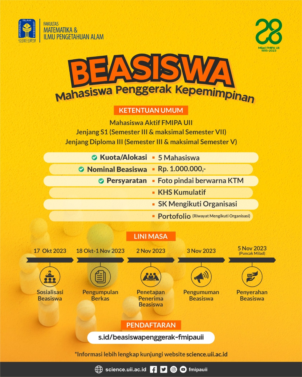 Di informasikan kepada mahasiswa aktif Fakultas Matematika dan Ilmu Pengetahuan Alam Universitas Islam Indonesia, bahwa FMIPA UII membuka Pendaftaran Beasiswa Mahasiswa Pengerak Kepemimpinan dalam rangka Milad Ke-28 Fakultas MIPA UII.