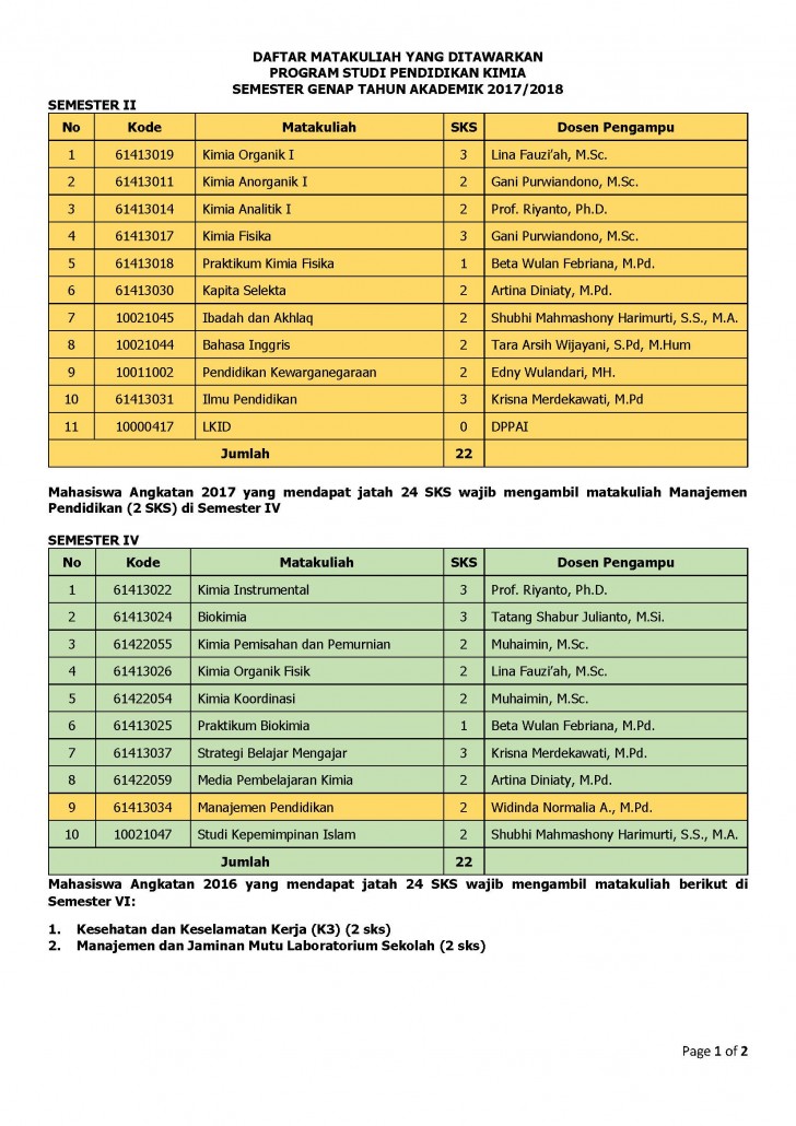 1. Daftar Matakuliah yang ditawarkan pada semester Genap T.A. 2017/2018: